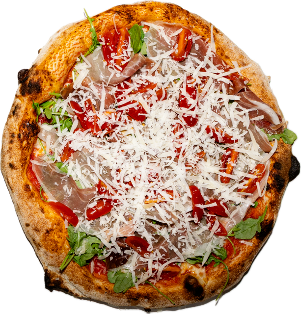 Sauce tomate, mozzarella, roquette, tomates cerises, jambon de parme, copeaux de parmesan