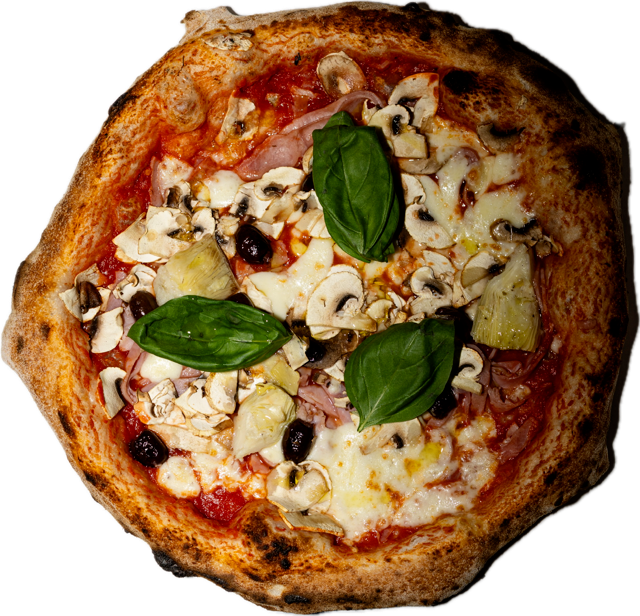 Sauce tomate, mozarella, jambon, champignons, olives, artichauts